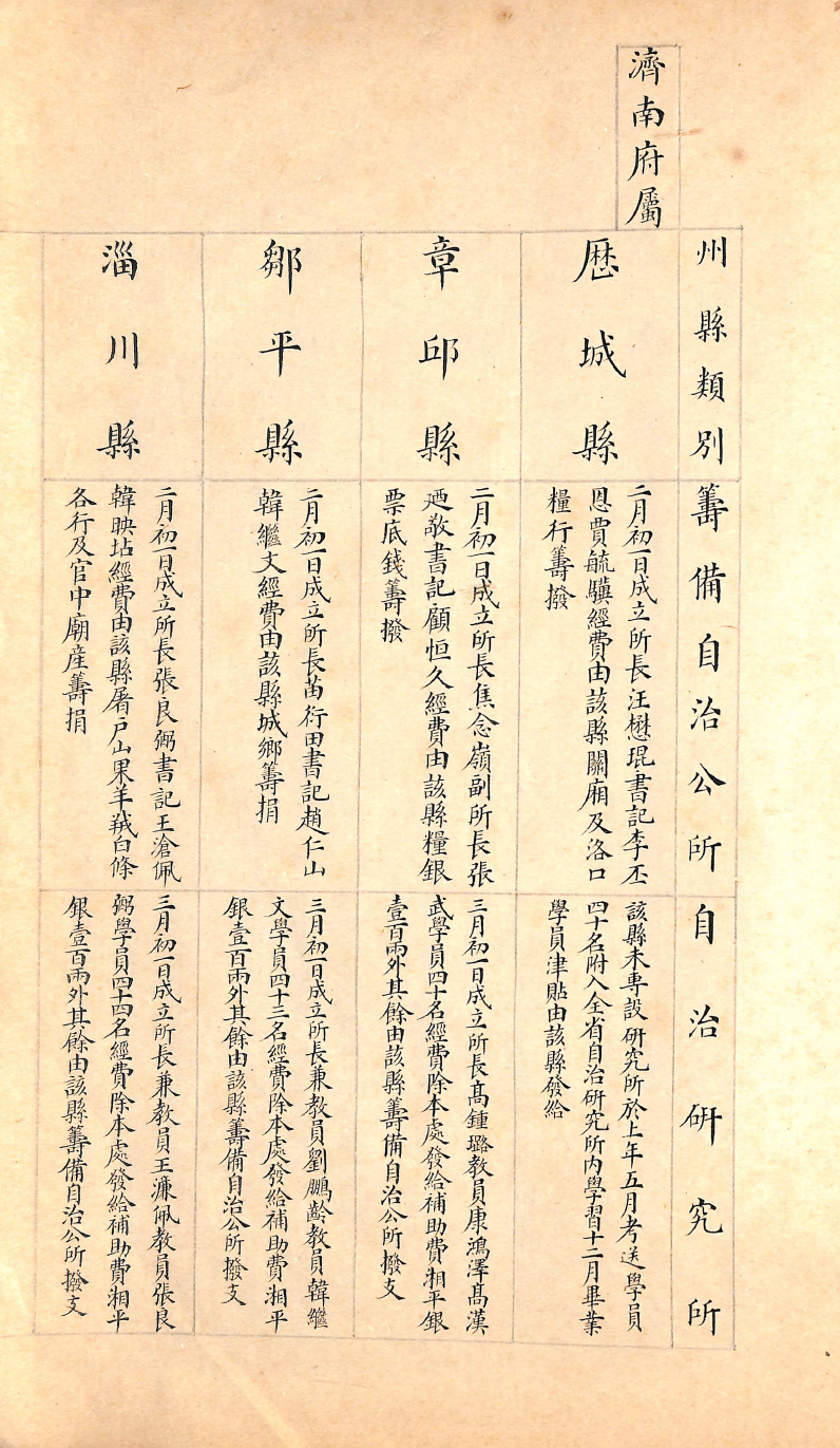 在訓練自治人才方面,由省籌辦訓練種子人員。依據宣統元年2月16日山東巡撫袁樹勛奏報籌辦地方自治設立自治研究所事由所載:「於上年冬間即擬定自治研究所章程,計東省一百零七州縣,每處選派二人到省入讀所研究… …業餘本年二月初一日開課… …一俟養成此項自治人才略有基礎再推行…」。如同在省由督撫親辦地方自治,州縣公所與自治研究所,也多由知縣親自主持或委任相當層級人員主辦。例如省治所在的濟南府歷城縣自治公所所長汪懋琨,曾任上海縣知縣累遷正三品高官;光緒30年山東奏准開設海外通商並自定章程,為時任巡撫周馥借重上海經驗,延攬汪懋琨返鄉出任新設立的山東商務總會總理,並於通志局編史修志。惟目前所見地方志等文獻史料,均無記載汪懋琨也曾任家鄉故里歷城縣的自治公所所長事,這也正是本件所載近五千人姓名所在等原始資料,可做為補足史志不足的可貴之處。