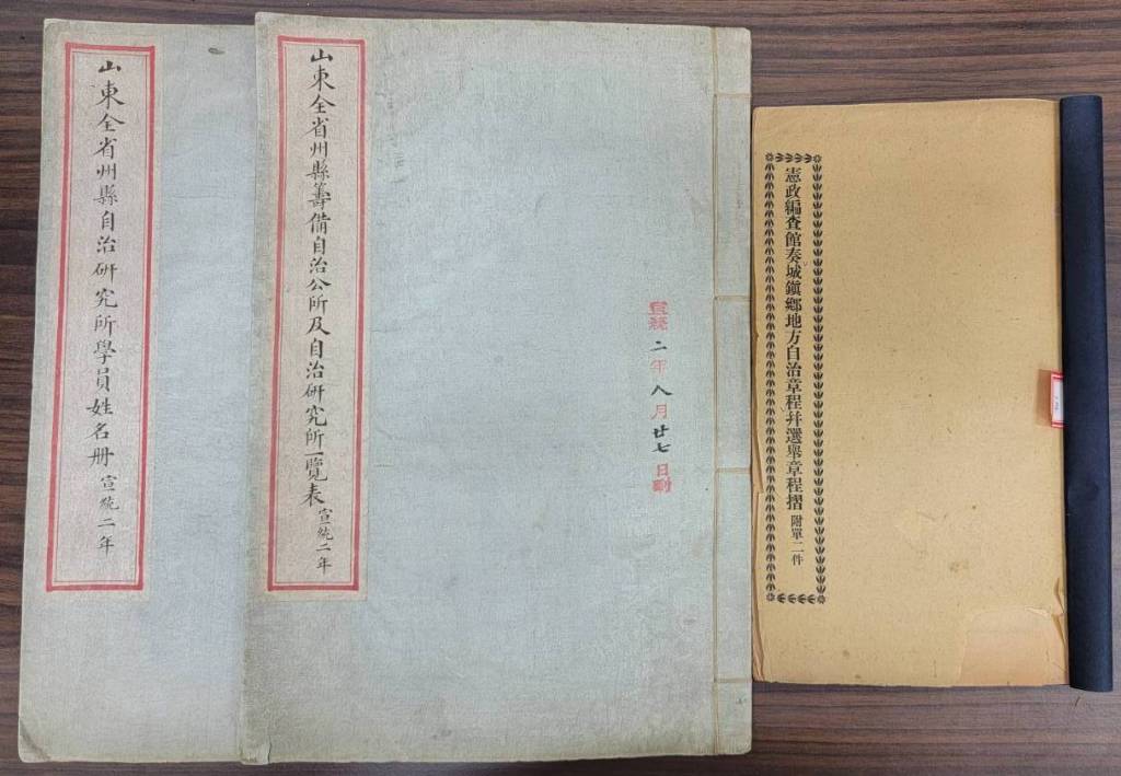 宣統二年《山東全省籌備自治公所及自治研究所一覽表》《山東全省州縣自治研究所學員姓名冊》寫本兩冊,並有《憲政編查館奏城鎮鄉地方自治章程並選舉章程摺附單二件》,為詳記關於清末新政地方自治辦理情形之原始檔案文獻,即非僅有,也是罕見!
