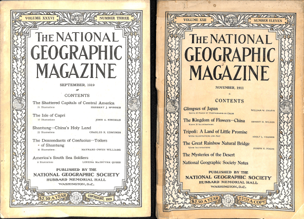 1. 1911年11月號,William W. Chapin 的《日本一瞥》,計37頁中有多達44張多數都還是彩色的照片,寫真還原了明治時期的日本人物、街景、風俗與景觀。有日本學者(1, 2)認為,藝妓 (geisha) 這個詞是在這篇文章的照片說明中首次使用的,還出現了日本藝妓的第一張照片。在這種以照片形式的視覺主導的文章中,有多張照片描繪了穿著和服的年輕女性,及其他主題的女性人物。當這些日本女性形像出現在英美精英男性讀者青睞的國家地理雜誌的注視下時,關聯了西方傳統的日本天真、純潔、聽話的年輕女孩的形象,這或也同源於約翰·路德·朗 (John Luther Long) 的《蝴蝶夫人》(Madam Butterfly) 所流行的形象。例如,作者在一張照片的說明文字中,提到校園中的三位女性,舉手投足間就呈現自然的藝術美姿。本篇中還有包括百餘年前京都的金閣寺、厳島神社的多寶塔、日光德川家康將軍長眠之東照宮、廣島海上鳥居在滿潮與低潮時、人力救護車、藥妝店、走方僧侶、旅道中的茶室(作者特別提到不同於多數是年輕女服務生的這間是倍感親切的一對老夫婦)、在家中怡然自得飲茶的女性(作者也提到日本傳統坐姿是西方人無法感受舒適的)、櫻花祭時節東京郊外荒川區嶺上的舞者群眾等等的珍貴彩色相片,非常值得珍藏保存並一窺百年前的日本實際。