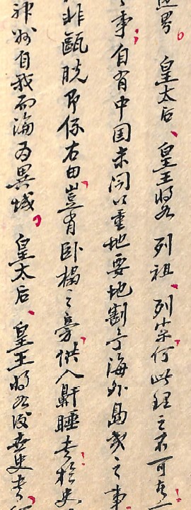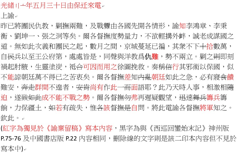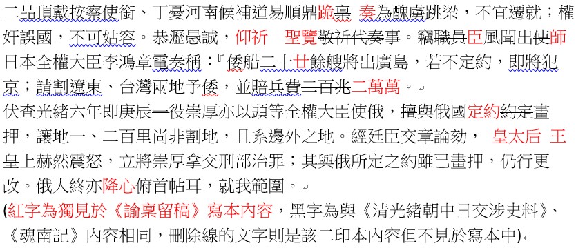 在如上圖文中首段的差異,即可看出寫本中的為較早手稿。寫本中原先為”仰祈聖覽”,後因由督察院代遞而改成”敬祈代奏”、”臣”改為”職員”。較不尋常的是,當時馬關條約已於當年稍早的3月23日簽訂,正式國書寫的是「賠款庫平銀貳萬萬兩」,但在故宮本中卻是用慣稱的二百兆!「兆」在中國古代已有多重意義,可能代表百萬、萬億、億億等。在清朝許多的時候,兆代表的是百萬,所以二百兆等於二萬萬等於二億。另外在故宮本史料中,易順鼎的呈文一律未見皇太后字樣,但在《諭稟留稿》寫本中(如右圖截錄)均先尊皇太后再寫皇王,此間奧妙就自有說法了,當再另文解析。