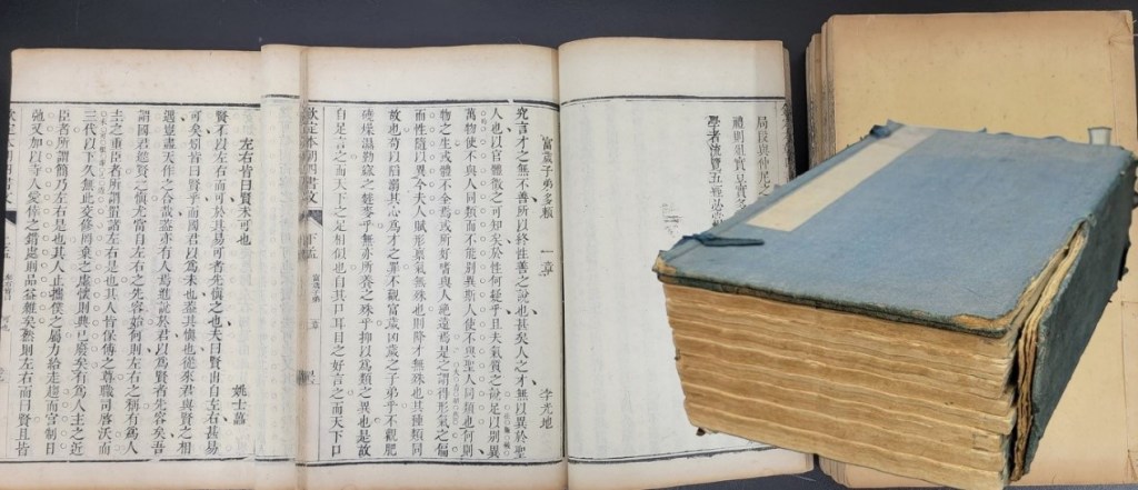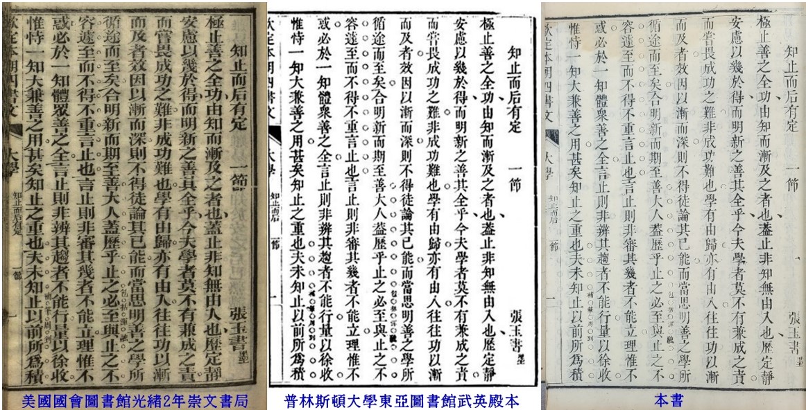 本拍品《欽定本朝四書文》即是清順治、康熙、雍正三朝時文選的單印集,內容包括目錄、大學(冊1)、上論(冊2, 3)、下論(冊4, 5)、中庸(冊6)、上孟(冊7)、下孟(冊8)等不分卷8冊,492葉,開本28.2×18.2cm。這未分卷、冊數、開本、行款等等的特點,都符合初編成時乾隆早期版本的體例。本拍品8冊除第一冊前半的上部有水漬,及少數頁面有文字拖曳與刷痕外,其餘品相均完好。圖中分別為美國國會圖書館藏,標示為「光緖二年夏月崇文書局開雕」;美國普林斯頓大學東亞圖書館藏,標示為「武英殿, 清乾隆5年」;與本書等三種,並列以為比較。另外在放大圖中也可看出,普大東亞圖書館定為武英殿本的刷印,也有小字模糊與拖曳重疊的瑕疵,也或許該本其實為後印、或其實也是翻刻而失察。相較於本拍品的同頁處,字跡印刷就爽朗秀麗更多了。當然本拍品中也有好幾處,尤其是時文後的評跋,見有拖曳與刷痕。三百年的故紙,總是難以說定高下優劣的。