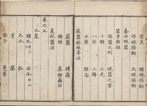 五、另外,在卷三中〈論桑種〉:「博聞録白桑少子壓枝種之若有子可便種須用地隂處其葉厚大得繭重實絲倍每常」。這句話的意思是:白桑樹很少結果子,需要壓枝繁殖。如果有了種子就可以直接種植。種植時需要選擇陰涼的地方,這樣桑葉會長得又厚又大,結出的蠶繭又大又重,絲的產量比平時高出一倍。德國延佑本、後至元本與清殿本等均作「絲倍每常」。本藏明張陳本為「絲每倍常」,也較符合原書已無存的校元本中所記載!