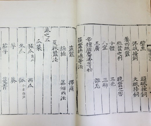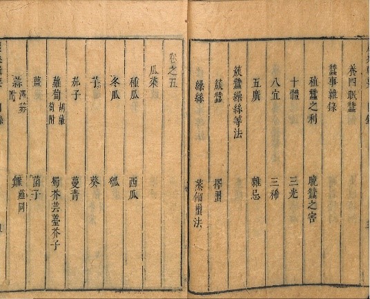 德國柏林國立圖書館,藏有杜善長序言的元延祐三年刊《農桑輯要》七卷大字本,早於後至元本。本人也幸得到一部書目中曾有明確記載,但卻不見於國內公藏中的,明張師說序、陳無私訂的《農桑輯要》七卷本(下稱明張陳本)。該書首尾完整,含序言、目錄。據著名中古農史農書權威日人天野元之助(1901-1980)稱,該明張陳本是據元本校刊覆刻,最較接近早期元刻本的。