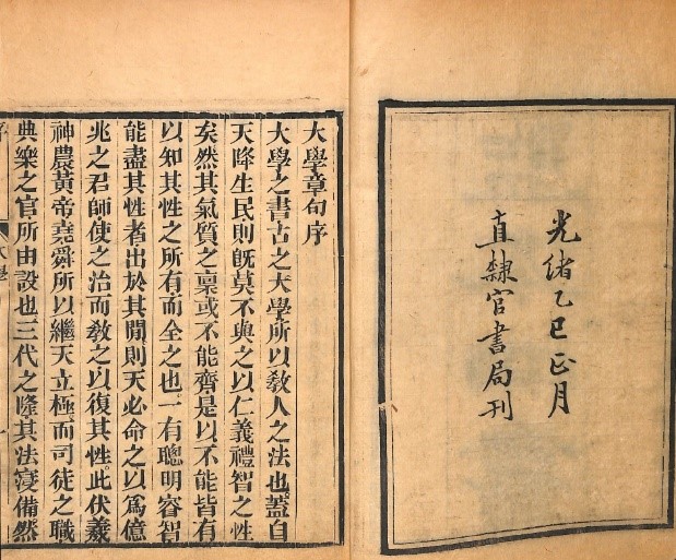 《四書》全稱《四書章句集注》,是南宋理學家朱熹的注釋。宋以前《五經》立於學官,唐孔穎達的《五經正義》是官定的經書注釋。宋時程、朱將《大學》、《中庸》、《論語》、《孟子》也作為經書,與《五經》並列。光宗紹熙元年朱熹刊刻其書包括《大學章句》一卷、《中庸章句》一卷、《論語集注》十卷、《孟子集注》七卷,四書名稱從此確立。元皇慶二年定考試課目必須在四書內出題,並以朱熹的集注為根據,其後一直到明清相沿不改,是為近六百年中國讀書人的思想圭臬。清初以內府所藏宋淳祐六年丙午補刻燕山嘉氏宣城大字本等,與繼承明北京國子監的板片等相互校考,校訂了十三經。查公藏目錄,名稱《監本四書》的本子並不多,官方或準官方的刊本更是稀缺;直隸官書局刊刻名《監本四書》的也僅此一種。值得注意的是,這部直隸官書局所刻於光緒乙巳年正月的《監本四書》,也可能是晚清最後一部準官方刻印的經部書籍。同年稍晚,即光緒三十一年八月初四日內閣奉上諭:「袁世凱等奏請立停科舉以廣學校,並妥籌辦法一摺….。著即自丙午科為始,所有鄉會試一律停止,各省歲科考試亦即停止」,自此大約也再無由準官方刻印四書五經等的需求了。